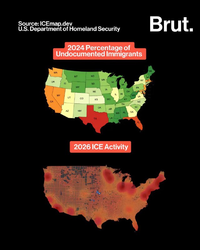 Карта процента мигрантов, находящихся в США без документов, в сравнении с картой активности ICE, составленной Министерством внутренней безопасности