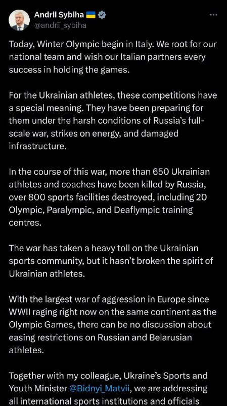В своём сообщении в соцсети X он напомнил, что на том же континенте, где проходят Игры, продолжается крупнейшая со времён Второй мировой войны война в Европе. По его словам, за время боевых действий россия убила более 650 украинских спортсменов и тренеров.Также, как отметил Сибига, было уничтожено свыше 800 спортивных объектов.