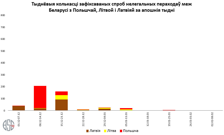 Выглядае на тое, што мінулы выпадак з дзьвума спробамі нелегальга перакрочыць беларуска-латвійскую мяжу (2 лютага) сапраўды быў выпадковым — штыль на ўсходніх межах Еўразвязу дасюль трывае. Апошнія чатыры тыдні агульная кольскасць спроб перакрочыць тыя межы вагаецца “каля нуля”.
