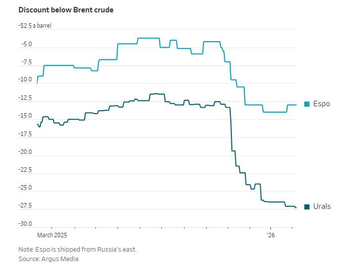 О трудностях России с продажей энергоносителей говорит тот факт, что по состоянию на 10 февраля около 143 миллионов баррелей нефти находятся на воде, ожидая покупателей, согласно данным компании по отслеживанию судов Vortexa. Это примерно половина месячного объема российской добычи, исходя из уровней производства 2025 года.
