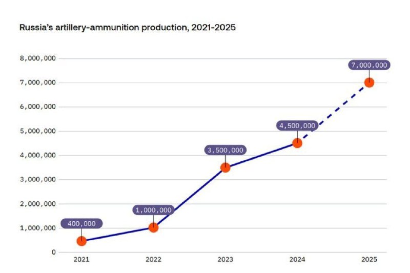 Согласно отчету эстонской разведки «Международная безопасность и Эстония 2026»,россия значительно нарастила производство боеприпасов,изготовив в 2025 году более 7 миллионов снарядов и ракет.