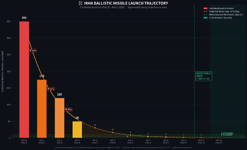 3. У Ирана, судя по всему, начали заканчиваться баллистические ракеты. Темп применения баллистики упал с 350 ракет в первый день войны до 50 в четвёртый. (Скрин 3). Вероятно, дело не только в количестве ракет, но и в пусковых установках, которые авиация США и Израиля выносят просто десятками. (Один из таких ударов на видео 4).