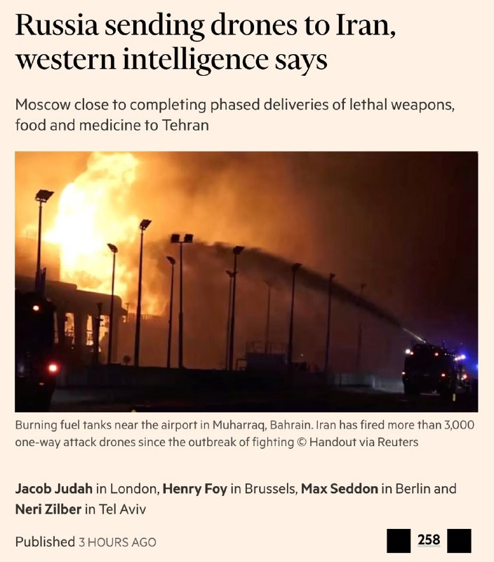 По данным западных разведок, Россия и Иран с первых дней войны обсуждают поставки дронов, а начаться они могут к концу марта – наряду с поставками медикаментов и продовольствия.