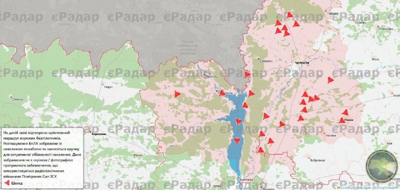 Отмечалось,что в это же время крупная группа ударных дронов следовала на запад вдоль границы Беларуси с возможными отклонениями курса. В 15:23 один из БПЛА пересёк украинско-беларусскую границу в районе Добрянки и направился в сторону Гомеля. Уже около 15:28 сигнал беспилотника пропал в районе Песчаной Буды Гомельского района, дальнейшая судьба аппарата неизвестна.