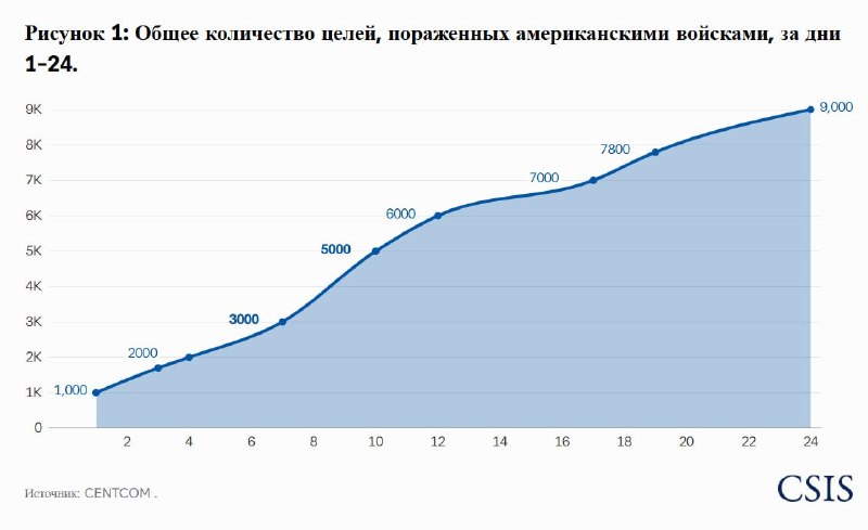 К 24-му дню суммарно США поразили около 9000 целей, при этом значительная часть “легких” целей была исчерпана, а дальнейшая работа требует более длительного цикла разведки, подтверждения и планирования ударов, к примеру, как с поражением подземных объектов.