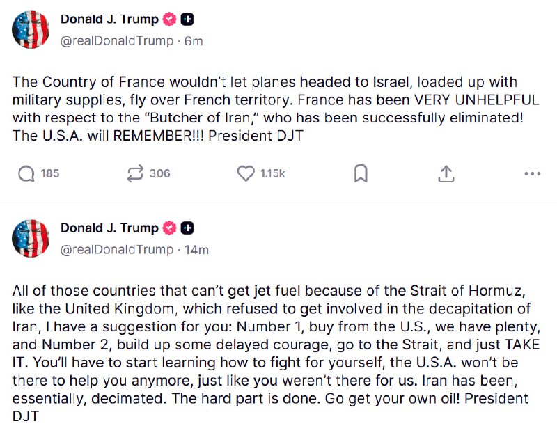 1️⃣Трамп заявил, что Франция не разрешила пролёт над своей территорией американским самолётам, которые везли военные поставки в Израиль. Трамп сказал, что Франция была “КРАЙНЕ БЕСПОЛЕЗНОЙ” в отношении “иранского мясника”, который был успешно уничтожен, и что США запомнят.