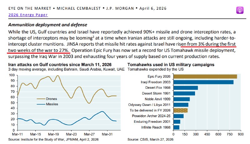 Согласно опубликованным вчера данным J.P. Morgan и института JINSA, процент попадания иранских ракет по Израилю увеличился с 3% в первые две недели войны до 27%.