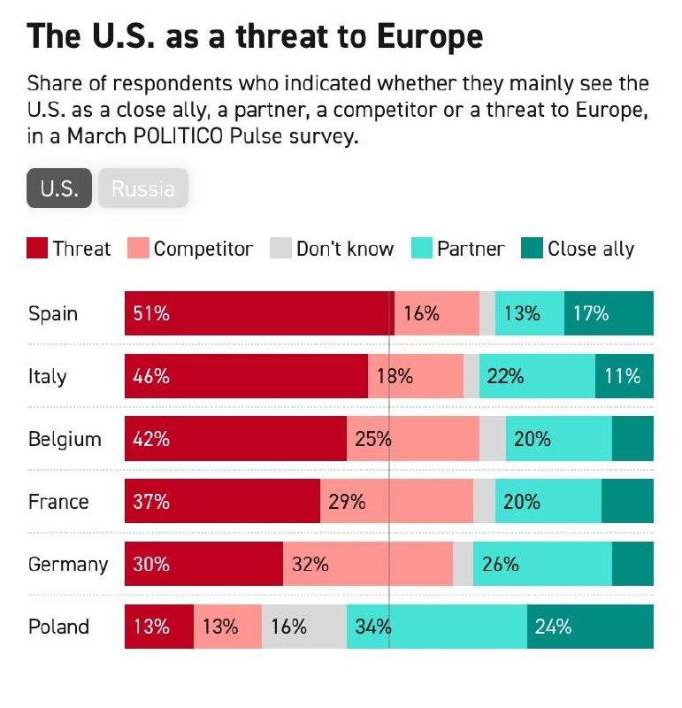 Дослідження, проведене Politico Polls у березні 2026 року у Франції, Іспанії, Німеччині, Італії, Бельгії та Польщі, зафіксувало наступне: