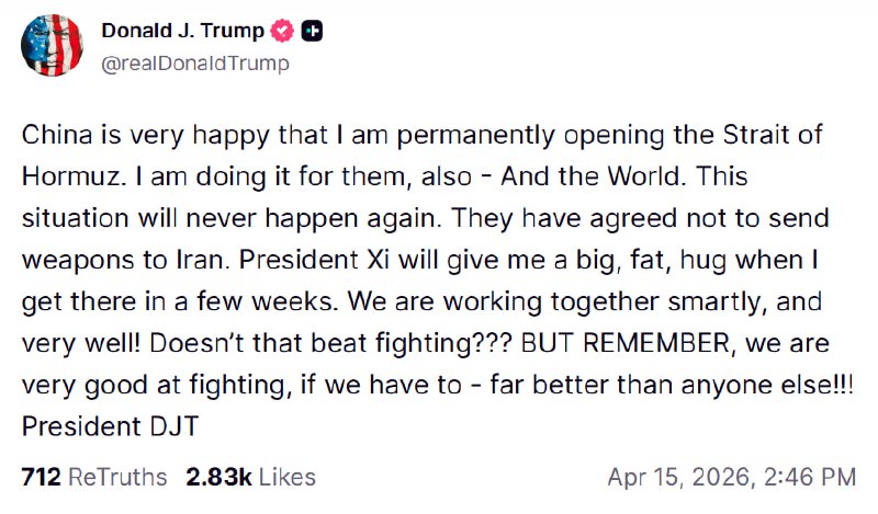 “Китай очень рад, что я перманентно открываю Ормузский пролив. Я делаю это для них – и для мира. Эта ситуация больше никогда не повторится. Они согласились не отправлять оружие Ирану. Президент Си даст мне большую крепкую обнимашку, когда я поеду туда через несколько недель. Мы работаем вместе с умом и очень хорошо! Разве это не лучше, чем драться??? НО ПОМНИТЕ, мы очень хорошо дерёмся, и если придётся – намного лучше, чем кто-либо!!!”.