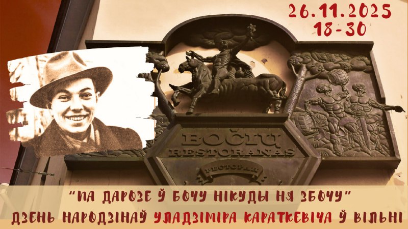 Збор у 18-30 ля помніка Гедыміну на Катэдральнай плошчы. Удзел бясплатны, але данаты экскурсаводцы вітаюцца. Таксама трэба будзе нешта замовіць у рэстарацыі. Прапануем разам распачаць такую віленскую традыцыю сьвяткаваньня Караткевіча!