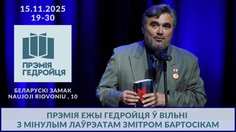 З гэтай нагоды прапануем вам у гэтую суботу а 19:30 сабрацца ў Беларускім Замку ў Вільні на літаратурную сустрэчу з мінулым лаўрэатам гэтай прэміі Змітром Бартосікам. Аўтар прэзэнтуе дзве свае кнігі, уганараваныя прэміяй імя Ежы Гедройця, а таксама прачытае ўрыўкі з будучай кнігі жыццёвых анекдотаў.
