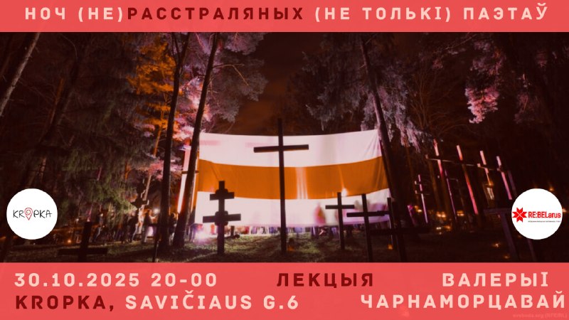 У чацьвер 30 кастрычніка а 20-00 запрашаем вас у Кропку (Savičiaus g.6) на лекцыю “Ноч (не)расстраляных (не толькі) паэтаў” ад даследчыцы, стваральніцы Віртуальнага музея савецкіх рэпрэсіяў ды экскурсаводкі Валерыі Чарнаморцавай, якая сама 3 гады таму была рэпрэсаваная ў Беларусі за экскурсіі Курапаты.