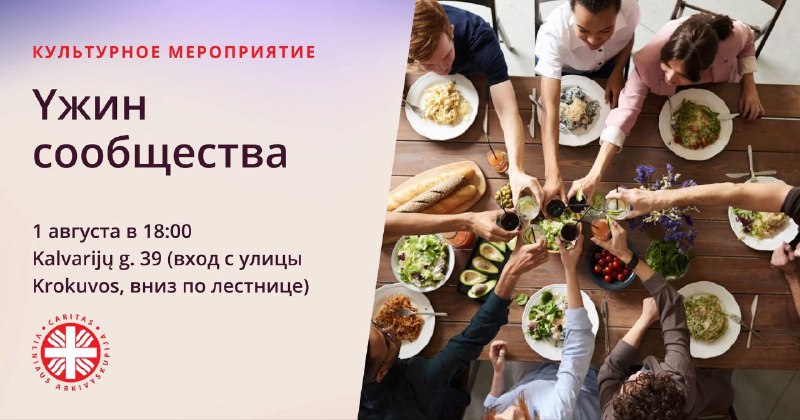 1 жніўня Цэнтр Caritas, Kalvarijų g. 39 (уваход з вуліцы Krokuvos, уніз па лесвіцы) 18:00 (калі хочаце гатаваць на месцы – прыходзьце раней) Тэма вечара – Літва
