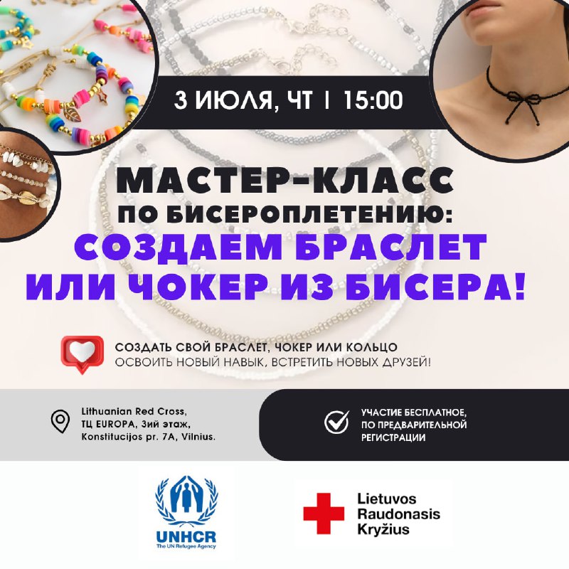 Литовский Красный крест приглашает мигрантов создать свой уникальный браслет или чокер на бесплатном мастер-классе по бисероплетению, который состоится в четверг 3 июля в 15:00!