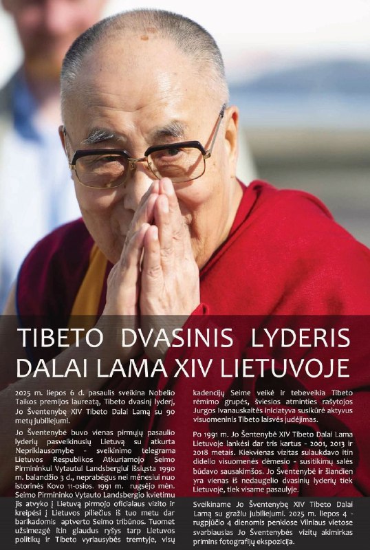 6 ліпеня свет павіншуе лаўрэата Нобелеўскай прэміі міру, духоўнага лідара Тыбету, Яго Святасць XIV Далай-ламу Тыбету з 90-годдзем. Вільнюс таксама далучыцца да гэтых віншаванняў: у розных частках горада будзе прадстаўлена фотавыстава, якая раскрывае гістарычныя моманты візітаў Далай-ламы ў Літву.