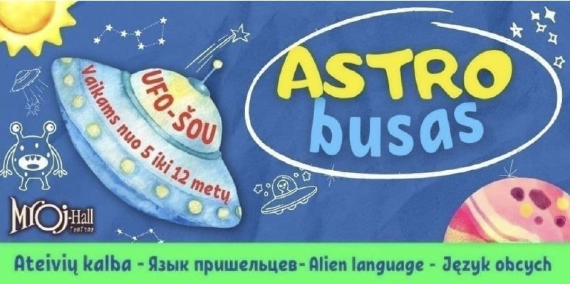 UFO-ŠOU “Astrobusas” – гэта імерсіўны спектакль-гульня для дзяцей ад 5 да 12 гадоў.