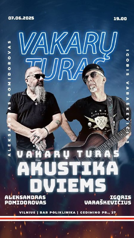 Легенда беларускага рока Ігар Варашкевіч (гурт “Крама”) і Аляксандр Памідораў з супольным акустычным… 07.06.2025Dapamoga LT | Замак у Вільнюсе Легенда беларускага рока Ігар Варашкевіч (гурт “Крама”) і Аляксандр Памідораў з супольным акустычным канцэртам у Вільні! Бар Poliklinika (былы “Пагоня”), Гедыміна, 27 7 чэрвеня ў 19:00УВАХОД ВОЛЬНЫ!