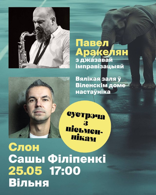 “Слон” — раман, які стаў бэстсэлерам за 5 дзён, беларускі пісьменнік Саша Філіпенка прэзентуе ў Вільні 25 траўня пад жывы джаз Паўла Аракеляна. Гэтая кніга — першае слова беларускай прозы пра расейска-украінскую вайну. Яна не выдаецца ў Беларусі.