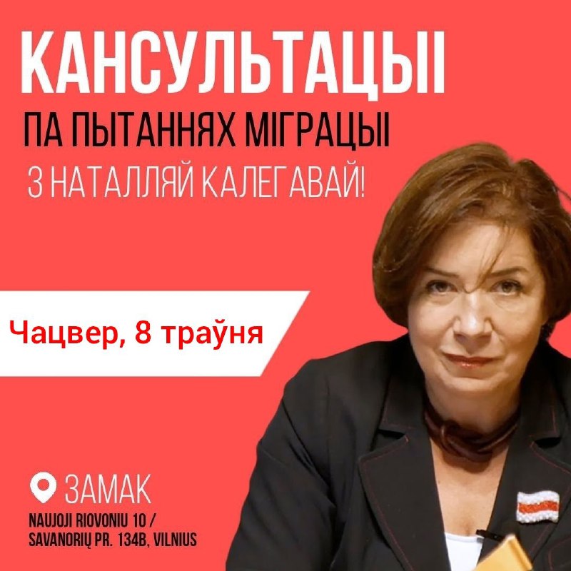 Паважанае спадарства, на гэтым тыдні традыцыйныя кансультацыі па пытаннях міграцыі з Наталляй Калег… 06.05.2025Dapamoga LT | Замак у Вільнюсе Паважанае спадарства, на гэтым тыдні традыцыйныя кансультацыі па пытаннях міграцыі з Наталляй Калегавай пераносяцца на чацвер 8 траўня з 18:00. Папярэдні запіс – абавязковы: @nk_dapamoga Чакаем Вас!Беларускі Замак, Naujoji Riovoniu 10