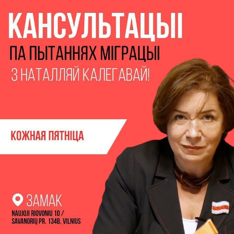 Паважанае спадарства,у нядзелю, а 15:00 Наталля Калегава будзе праводзіць у Замку традыцыйныя кансу… 07.03.2025Dapamoga LT | Замак у Вільнюсе Паважанае спадарства,у нядзелю, а 15:00 Наталля Калегава будзе праводзіць у Замку традыцыйныя кансультацыі па пытаннях міграцыі. Папярэдні запіс – абавязковы: @nk_dapamoga Чакаем Вас!Беларускі Замак, Naujoji Riovonių 10