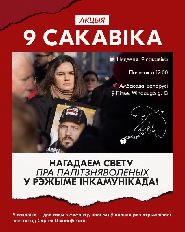 Збяромся каля амбасады Беларусі ў Вільнюсе, каб выказаць падтрымку палітзняволеным і запатрабаваць спынення іх ізаляцыі!