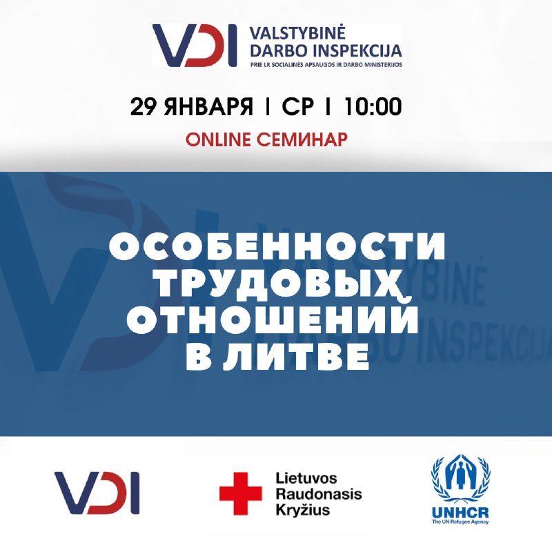 Lithuanian Red Cross приглашает вас зарегистрироваться и принять участие в онлайн-семинаре “Особенности трудовых отношений в Литве” Государственной инспекции труда Литовской Республики (VALSTYBINĖ DARBO INSPEKCIJA) , который состоится в среду 29 января в 10:00!