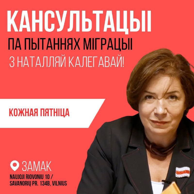 Паважанае спадарства, сёння, у пятніцу, з 18:00, Наталля Калегава будзе праводзіць у Замку традыцы… 03.01.2025Dapamoga LT | Замак у Вільнюсе Паважанае спадарства, сёння, у пятніцу, з 18:00, Наталля Калегава будзе праводзіць у Замку традыцыйныя кансультацыі па пытаннях міграцыі. Папярэдні запіс – абавязковы:@natalex_dapamoga Чакаем Вас!Беларускі Замак, Naujoji Riovoniu 10
