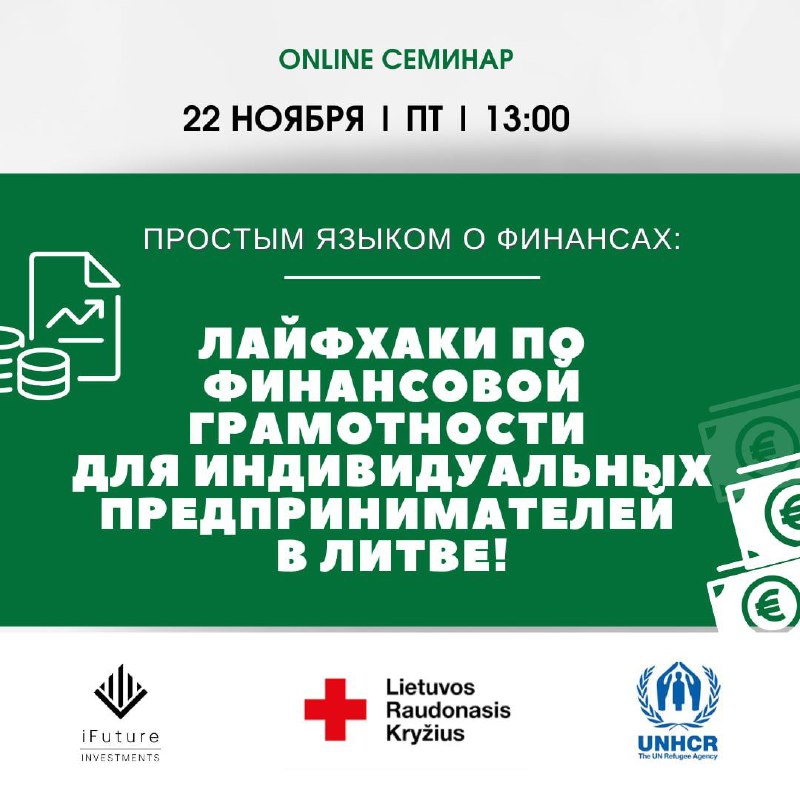 Lithuanian Red Cross запрашае вас зарэгістравацца і прыняць удзел у анлайн-семінары “Простай мовай аб фінансах: Лайфхакі па фінансавай адукаванасці для Індывідуальных прадпрымальнікаў у Літве!”, які адбудзецца 22 лістапада ў пятніцу а 13:00.