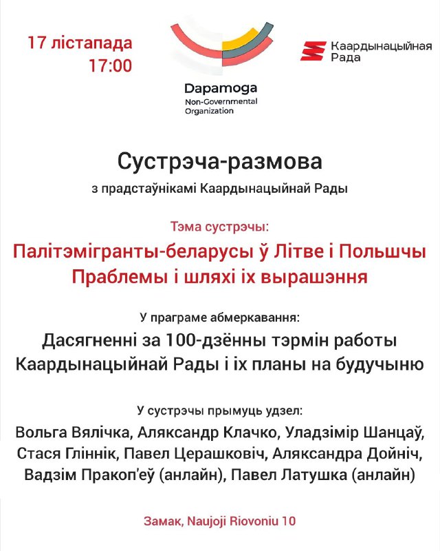 Арганізацыя «Дапамога» звярнулася да сяброў Каардынацыйнай рады, а таксама да спадара Латушкі з прапановай узяць удзел у сустрэчы 17 лістапада а 17.00 у Замку.