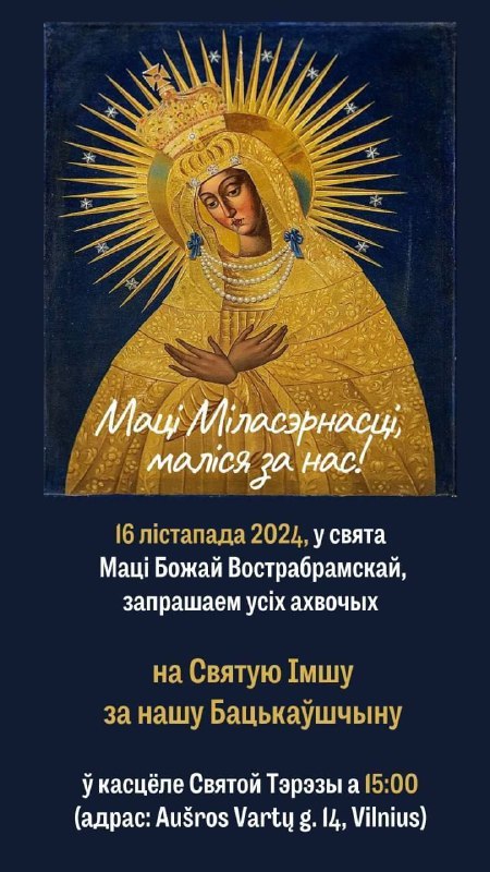 У свята Маці Божай Вострабрамскай запрашаем усіх ахвочых далучыцца да Святой Імшы за Беларусь у касцёле Святой Тэрэзы