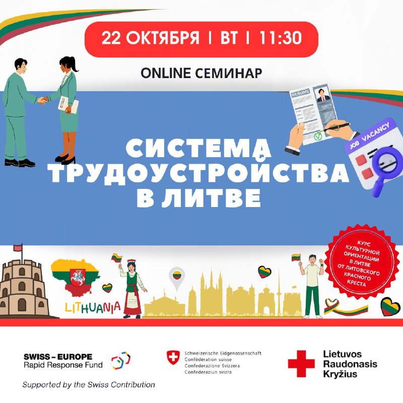 Запрашаем вас зарэгістравацца і прыняць удзел у бясплатным анлайн-семінары “Працаўладкаванне ў Літве”, які адбудзецца ў аў 22 кастрычніка ў 11:30 і будзе праводзіцца спецыялістамі Літоўскага Таварыства Чырвонага Крыжа на рускай мове.