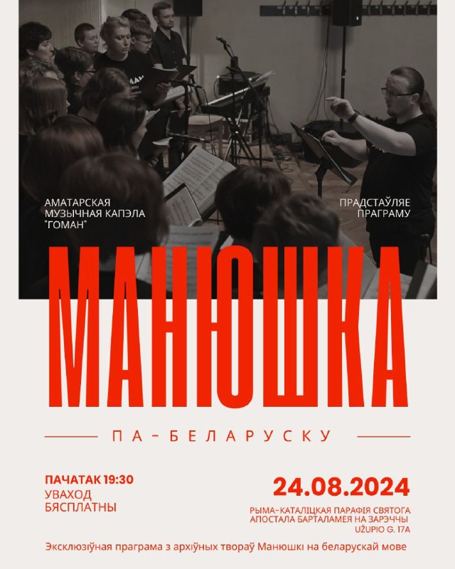 Аматарская музычная капэла “Гоман” з задавальненнем запрашае вас на канцэрт, прысвечаны выбітнаму кампазітару Станіславу Манюшку, які ўнёс неацэнны ўклад у развіццё беларускай, польскай ды літоўскай музыкі. Вы зможаце пачуць творы, якія, нажаль, рэдка выконваюцца ў Беларусі.
