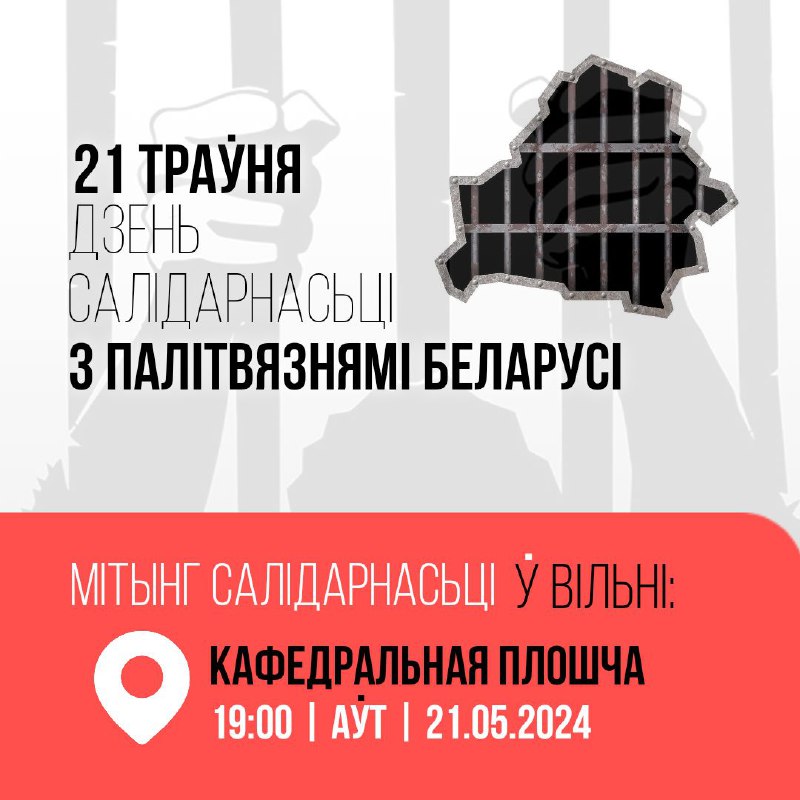заклікаем вас далучыцца да мітынга салідарнасці з палітвязнямі Беларусі, які адбудзецца 21 траўня а 19:00 на Кафедральнай плошчы ў Вільні. Не змоўчым!