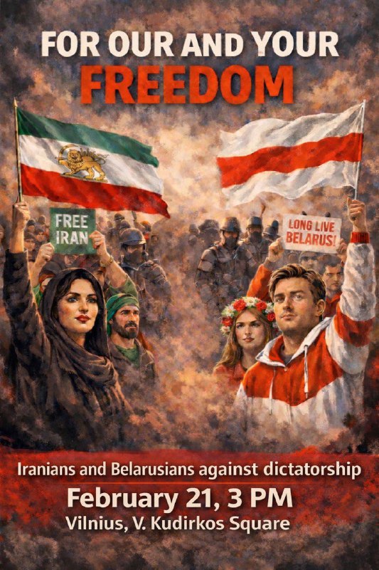 «За вашу и нашу свободу!» Иранцы и белорусы проведут совместную акцию в Вильнюсе 21 февраля суббота,… 19.02.2026Dapamoga LT | Замак у Вільнюсе «За вашу и нашу свободу!» Иранцы и белорусы проведут совместную акцию в Вильнюсе 21 февраля суббота, 21 февраля 2026 Вильнюс, площадь Винцаса Кудирки 15.00
