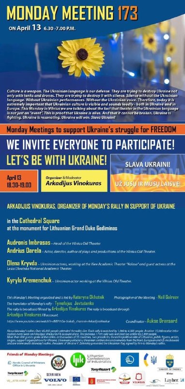 Сёння 13 красавіка а 18:30 адбудзецца ўжо 173-і панядзелкавы мітынг салідарнасці з Украінай на Кафедральнай плошчы, каля помніка Вялікаму князю літоўскаму Гедыміну.