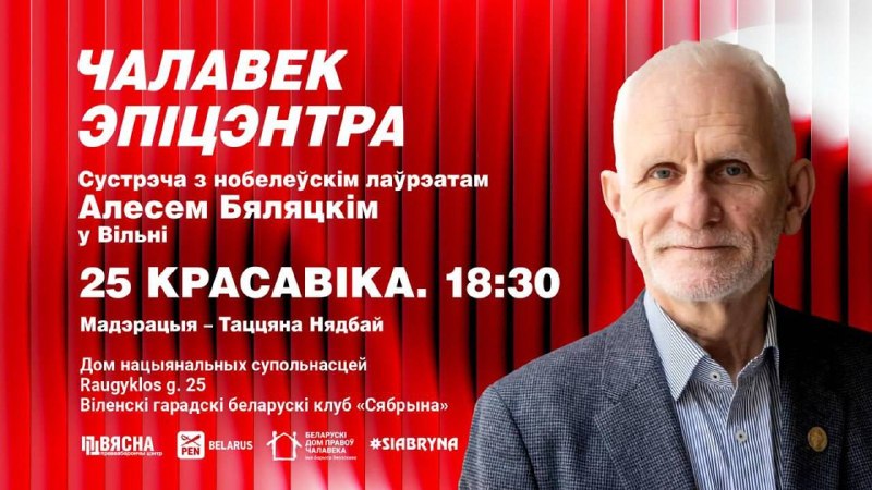 У суботу 25 красавіка а 18:30 запрашаем на сустрэчу з праваабаронцам, кіраўніком «Вясны» і нобелеўскім лаўрэатам АлесемБяляцкім у сталіцы Літвы.