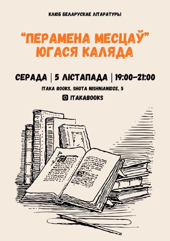 Новая сустрэча кніжнага клуба Тэма: Абмеркаванне твора Югасі Каляды “Перамена месцаў” Дата: 5 ліста… 29.10.2025Прастора КРОПКА. Тбілісі Новая сустрэча кніжнага клуба Тэма: Абмеркаванне твора Югасі Каляды “Перамена месцаў” Дата: 5 лістапада (серада) Час: 19:00-21:00 Месца: Itaka Books Уваход вольны, але патрэбны запіс праз форму.