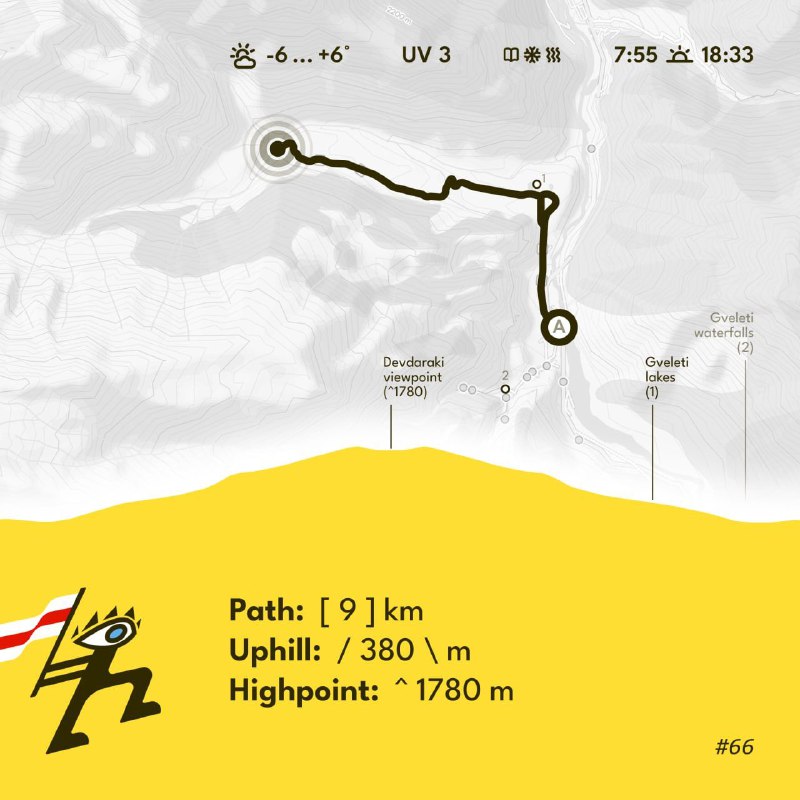 -6…+6°, пераменная сонечнасць. Паход + вадаспады: 5~7 гадзін. Трансфер: 70…50 лары з чалавека (больш людзей – менш кошт).