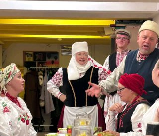 На стале — багатыя пачастунакі: халадзец, бульба, сала, агуркі, яйкі, хатняя настойка. Госці чокаюцца кубкамі, смяюцца і клічуць: “Горка!” — каб маладыя пацалаваліся.