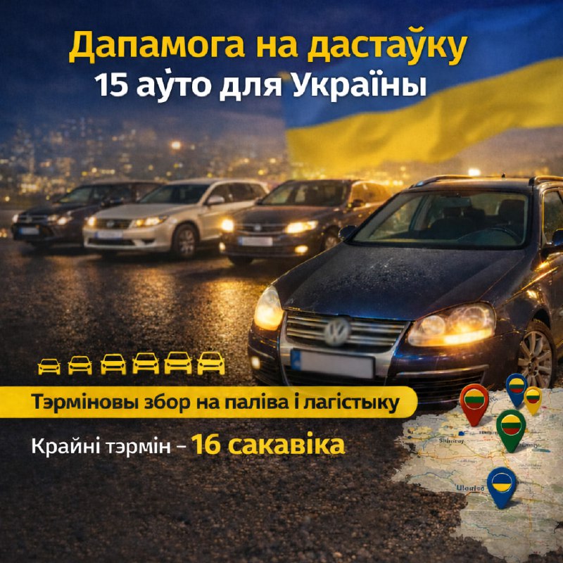 Украінскі бок просіць беларускіх валанцёраў сабраць гэтыя машыны па Літве (Шаўляі, Таўраге, Клайпеда, Уцена, Алітус, Вільня) для адпраўкі ва Украіну. Мы шукаем упэўненых кіроўцаў катэгорыі B у Вільні (як мужчын, так і жанчын) для гэтага валанцёрства 16 і 17 сакавіка (панядзелак, аўторак).