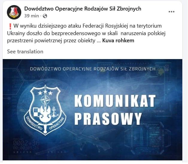 «В результате сегодняшней атаки Российской Федерации на территорию Украины произошло беспрецедентное по масштабу нарушение границ польского воздушного пространства объектами типа «дрон». Это акт агрессии, который создал реальную угрозу для наших граждан», — заявило Оперативное командование польской армии в соцсетях.