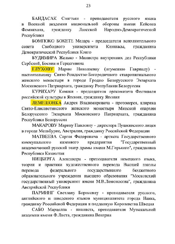 Медалём Пушкіна Пуцін уганараваў ігуменню Гаўрыілу (Глухаву) з Горадні і протаіерэя Елісавецінскага манастыра ў Менску Андрэя Лемяшонка, – паведамляе «Хрысціянская візія».