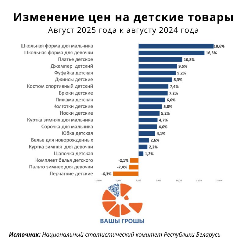 С августа 2024-го по август 2025-го детские товары в Беларуси росли в цене быстрее среднего уровня инфляции. Особенно резко подорожала школьная форма: