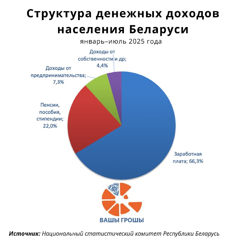 Две трети доходов беларусов (66,3%) — это заработная плата. Еще 22% — пенсии, пособия и стипендии. А доходы от предпринимательства составляют всего 7,3%. Такая структура денежных доходов населения показывает, что экономика страны держится не на инициативе граждан, а на их зависимости от работодателя — чаще всего государственного. А также на социальных трансфертах — ведь почти каждый пятый рубль доходов беларусы получают в виде пенсий и пособий.