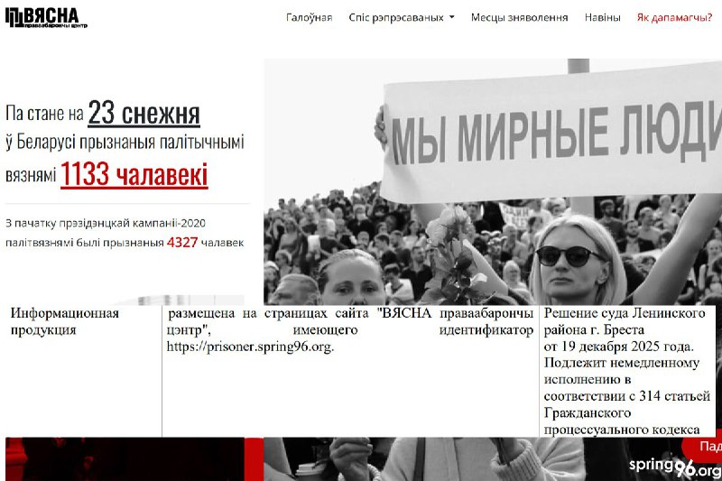 Страницу на сайте «Вясны» со списком политзаключенных признали «экстремистской». «У спісе Мінінфарма… 23.12.2025Мінск Навіны Страницу на сайте «Вясны» со списком политзаключенных признали «экстремистской». «У спісе Мінінфарма гэтае рашэнне ўнесенае з памылкай», — заметили правозащитники. https://zerkalo-read1.space/news/life/116591.html?tg=5 Не работает ссылка? Попробуйте эту, из Беларуси — с VPN. Скачайте наше приложение для Android или iOS.