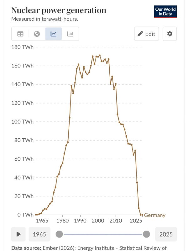 Вот график ядерной энергетики Германии. Со 170 тераватт-часов в год до нуля. Это не просто энергетическая политика, это стратегическое самоубийство. Германия сама себя лишила дешёвой и чистой энергии, сделала себя зависимой от российского газа.