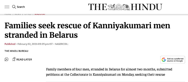 Жена одного из застрявших в РБ заявила, что в декабре 2025 года ее муж, Т. Тхангасвами, уехал через агентство по трудоустройству, заплатив тому $4400. По словам женщины, ее муж находится в Беларуси почти два месяца, но за это время ему не предоставили работу, надлежащее жилье и питание.