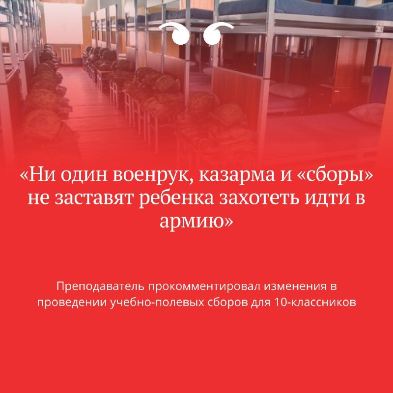В Беларуси десятиклассников отправят на круглосуточные сборы — с условиями, как в армии. Сообщается,… 10.04.2026Мінск Навіны В Беларуси десятиклассников отправят на круглосуточные сборы — с условиями, как в армии. Сообщается, что проведение учебно-полевых сборов предусмотрено в условиях, приближенных к условиям воинской части в формате круглосуточного пребывания учащихся. Преподаватель в интервью Филину на условиях анонимности прокомментировал изменения в проведении учебно-полевых сборов для 10-классников: https://d2rae64slocnmt.cloudfront.net/post/ni-odin-voenruk-kazarma-i-sbory-ne-zastavyat-rebenka-zaxotet-idti-v-ar/213456/