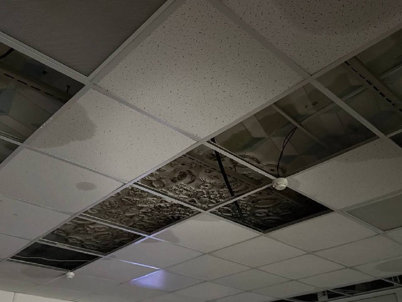 Вада падтапіла кабінет і праз перакрыцці пацякла ўніз, дзе столь не вытрымала яе цяжару.