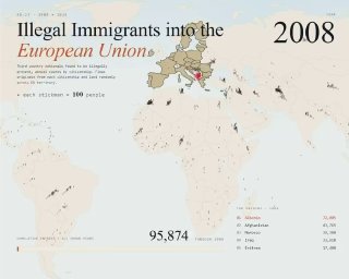 Так вот, тут подъехала интересная видеографика, показывающая проникновение нелегальных иммигрантов в Европейский Союз с 2008 года. Каждая точка на видео – это 100 мигрантов.
